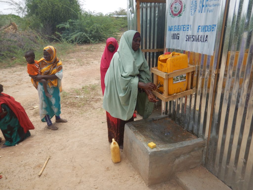In the attached image, HIDIG WASH staff demonstrate proper handwashing practices at a newly constructed latrine block under the SHF-funded project in Beletweyne District. Community members participated in hygiene promotion sessions focusing on sanitation maintenance and safe water practices.