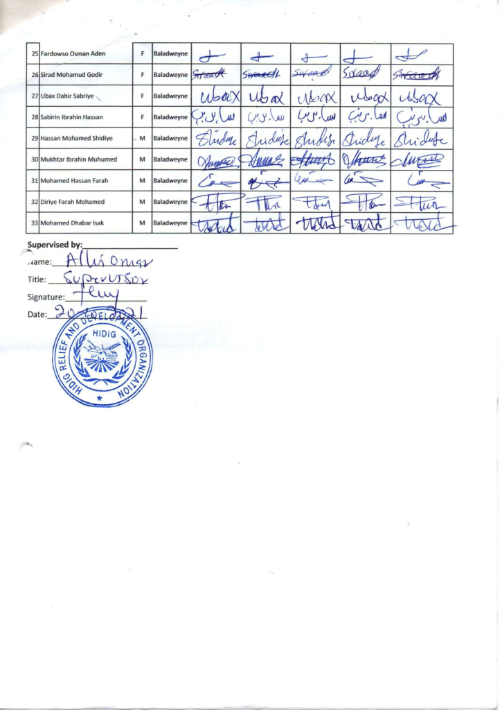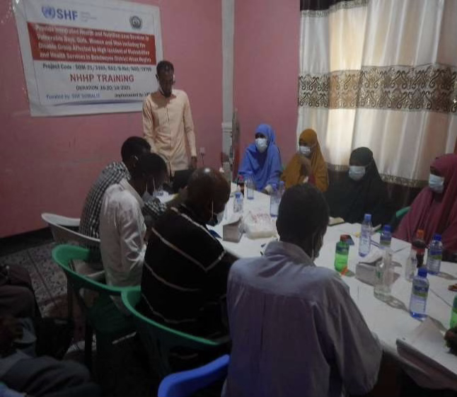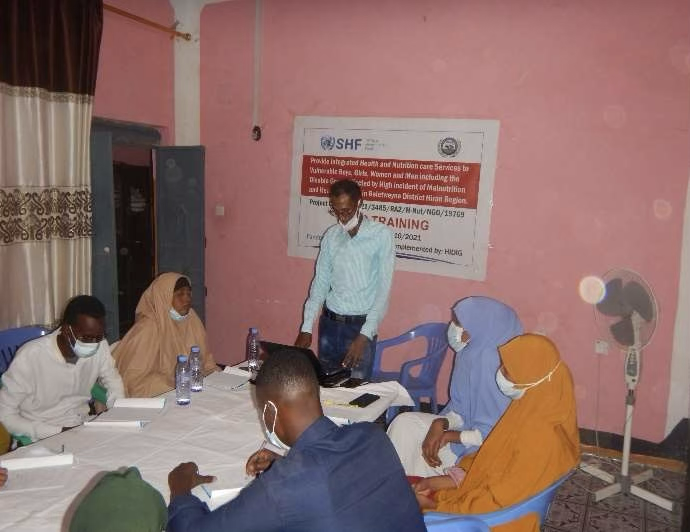 HIDIG organization is one of the national organization working on humanitarian intervention in Bay, Bakol and Hiran region through provision of primary health care services as well as nutrition and other humane intervention, however, having the main beneficiaries are vulnerable and displaced population in Hiran, Bay and Bakol region and the field staff are in contact of huge number of these displaced community member with poor health status .The new emergency project consists of three components that is health, Nutrition and WASH program where the project have this period trained project health staff with Nutrition, hygiene and health promotion(NHHP) this was intended to give basic skills and knowledge so the staff are able to deliver quality services delivery to the affected population