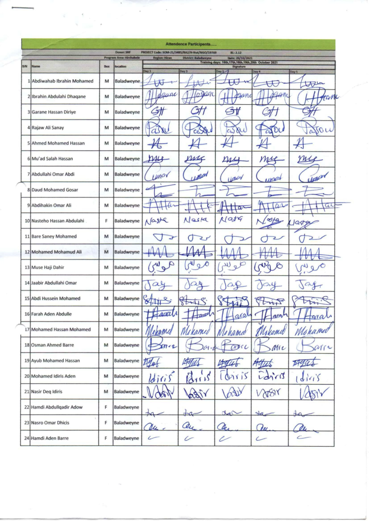| 1 | Mr:Ali Yusuf Hussein | Godir Restaurant and Cafeteria | 16-20th Sept,2021 | 5 | NHHP training |
