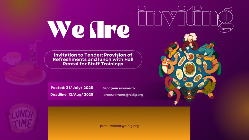 HIDIG Relief and Development Organization (HRDO) is seeking qualified service providers to deliver lunch and refreshments as well as provide hall rental for training sessions for project staff. Bidders are required to provide detailed food menus and ensure meals are hygienic, diverse, and culturally appropriate.