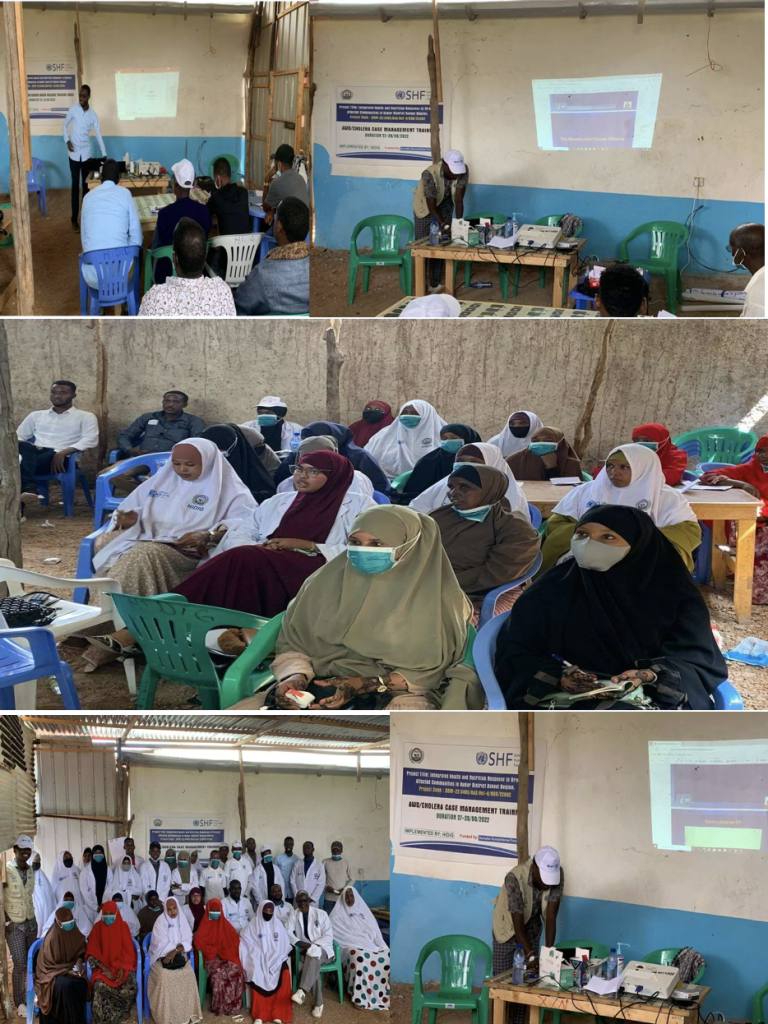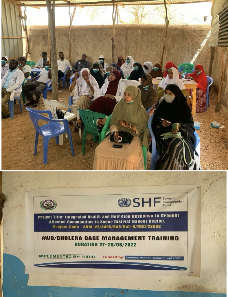 HIDIG organization is one of the national organization working on humanitarian intervention in Bay, Bakol and Hiran region through provision of primary health care services as well as nutrition and other humane intervention, however, having the main beneficiaries are vulnerable and displaced population in Hiran, Bay and Bakol region and the field staff are in contact of huge number of these displaced community member with poor health status .The new emergency project consists of three components that is health, Nutrition and WASH program where the project have this period trained project health staff with integrated AWD/cholera case management (AWD) this was intended to give basic skills and knowledge so the staff are able to deliver quality services delivery to the affected population